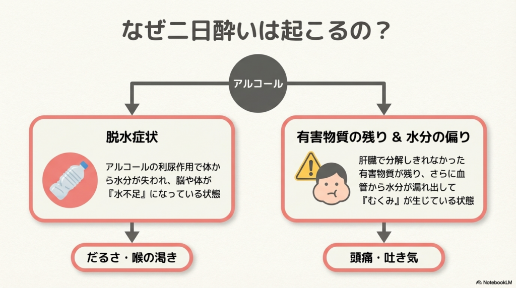 1. ✔脱水症状:アルコールの利尿作用で体から水分が失われ、脳や体が「水不足」になっている状態(だるさや、ひどい喉の渇きの原因です)。