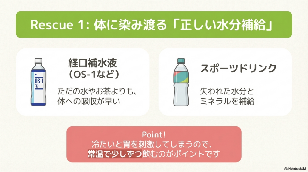 二日酔いの体は、カラカラの砂漠状態です。まずは失われた水分とミネラルを補給しましょう。 ただの水やお茶よりも、体への吸収が早い「経口補水液(OS-1など)」や「スポーツドリンク」が特におすすめです。冷たいと胃を刺激してしまうので、常温で少しずつ飲むのがポイントです。