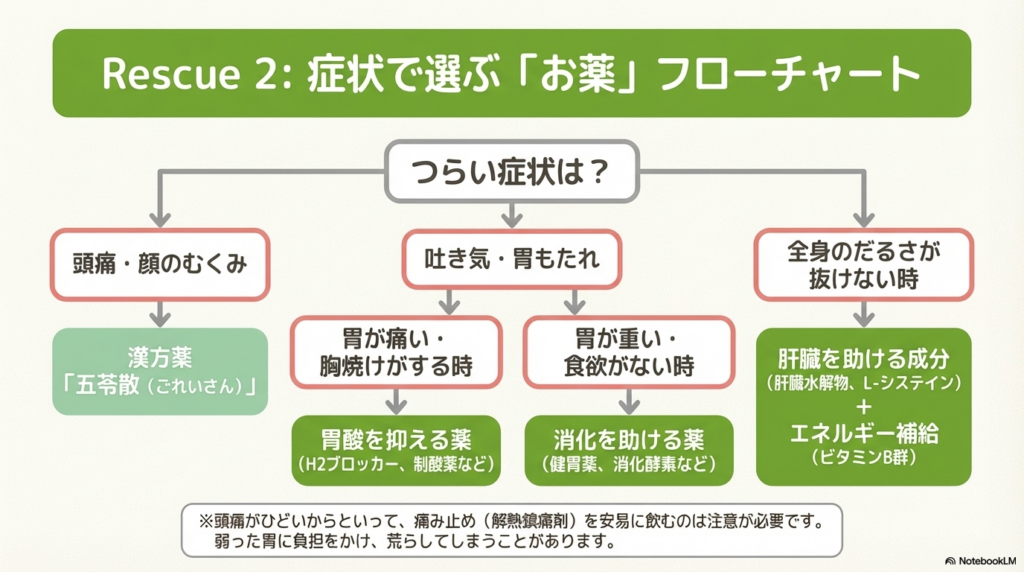 • ・胃が痛い・胸焼けがするとき: アルコールで胃酸が出すぎて荒れている状態です。「H2ブロッカー」や「制酸薬」など、胃酸を抑えるタイプが適しています。