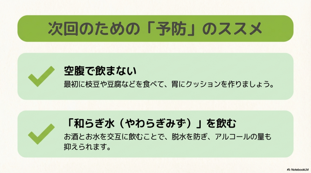 • ✔空腹で飲まない:最初に枝豆や豆腐、サラダなどを食べて、胃にクッションを作りましょう。