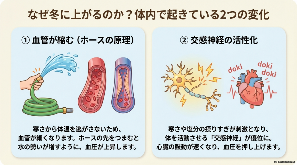 寒いと感じると、体は熱を逃がさないように、皮膚の表面にある血管をギュッと細く縮めます。これは、ホースの先を指でつまむと水の勢いが強くなるのと同じ原理です。血管が狭くなると、血液の通り道が減り、血管の壁にかかる圧力(血圧)が高くなります。