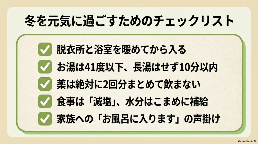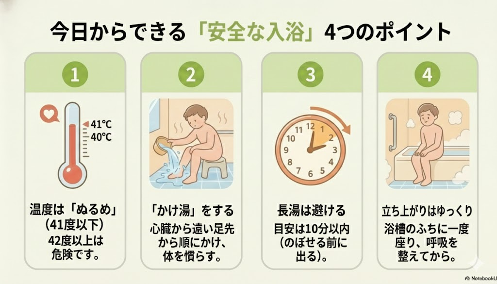 お湯の温度は41度以下を目安にしましょう。熱いお湯は血圧の急激な変動を引き起こしやすくなります。