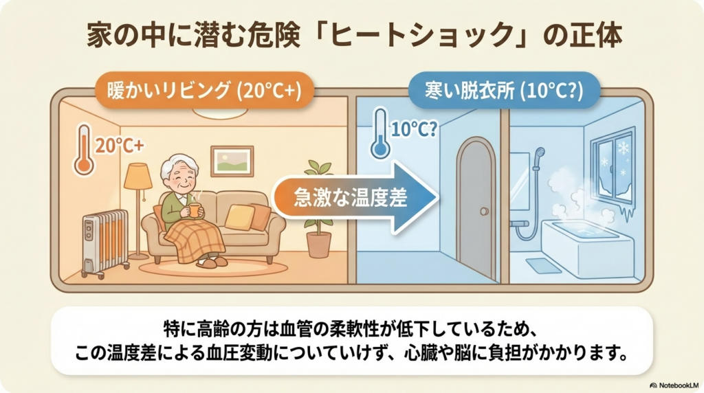 寒い脱衣所で服を脱ぐと、血管が縮んで血圧が跳ね上がります。