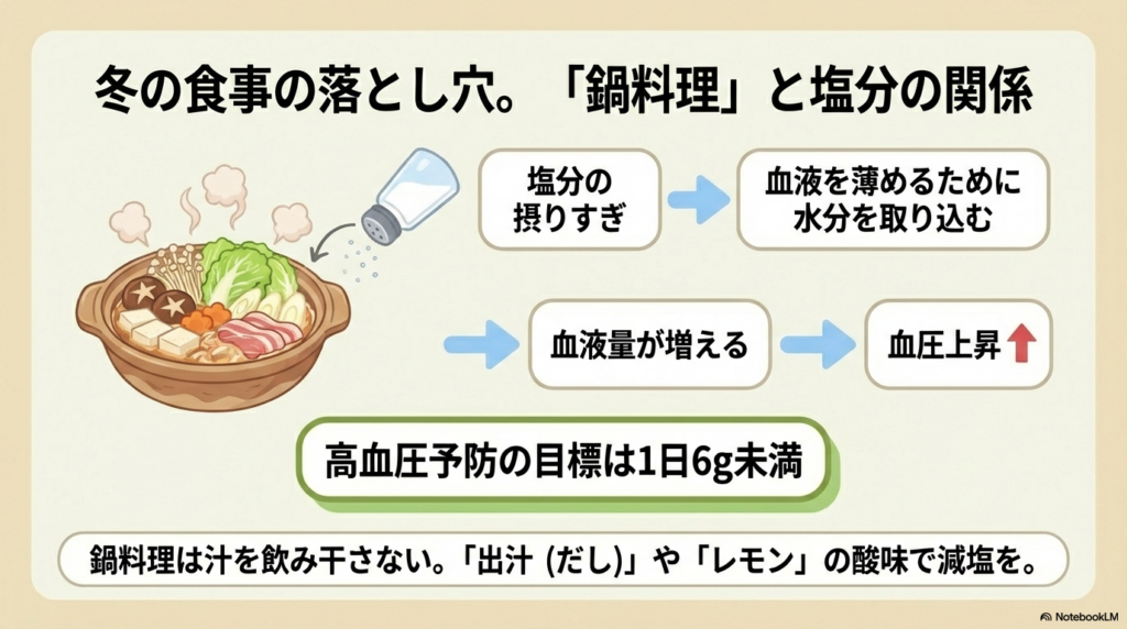 冬は鍋料理など塩分の多い食事が増えがちです。出汁やレモン果汁を上手に使って、美味しく減塩を心がけましょう。