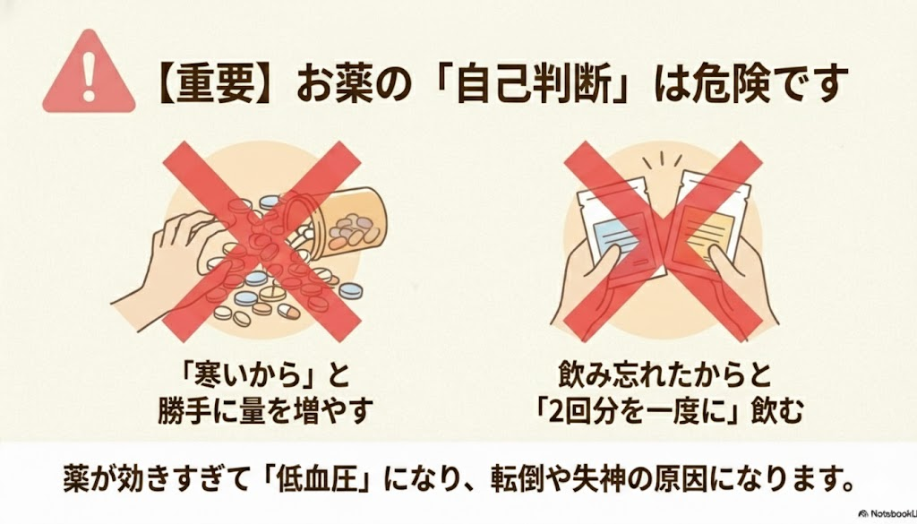 血圧のお薬を飲んでいる方に、特に気をつけていただきたいのが「寒い時期だからと自己判断で量を増やす」「飲み忘れたからと2回分をまとめて飲む」ことです。