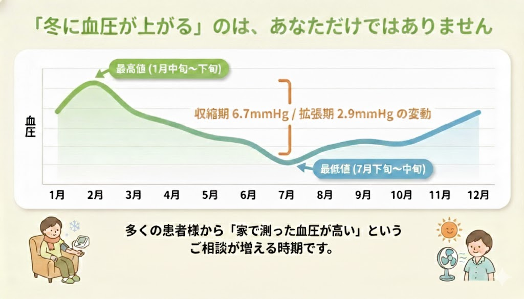 1月、寒さが本格的になると「最近、家で測った血圧が高めで心配です」というご相談が増えてきます。実は、冬場は夏場に比べて上の血圧が平均5〜10mmHgほど上昇することが知られています1)