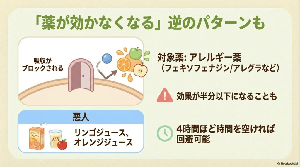花粉症などでよく使われるアレルギーのお薬(フェキソフェナジンなど)は、リンゴジュースやオレンジジュースと一緒に飲むと、小腸から薬を吸収する働きが邪魔されてしまい、血中濃度が最大70%も低下して薬の効き目が悪くなってしまうことが分かっています 。