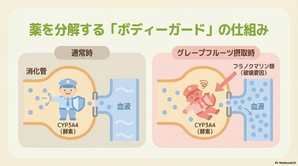 グレープフルーツには「フラノクマリン類」という成分が含まれているのですが、これが小腸にある薬を分解する酵素(CYP3A4)の働きを止めてしまい、普段なら小腸で分解されるはずのお薬がそのまま体に吸収されてしまいます。そのため血液中の薬の濃度が予想以上に高くなることで、副作用が出やすくなってしまうのです。