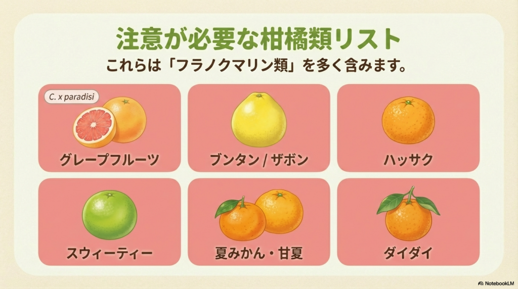 実は、グレープフルーツの仲間である柑橘類の中には、同じように注意が必要なものがあります。