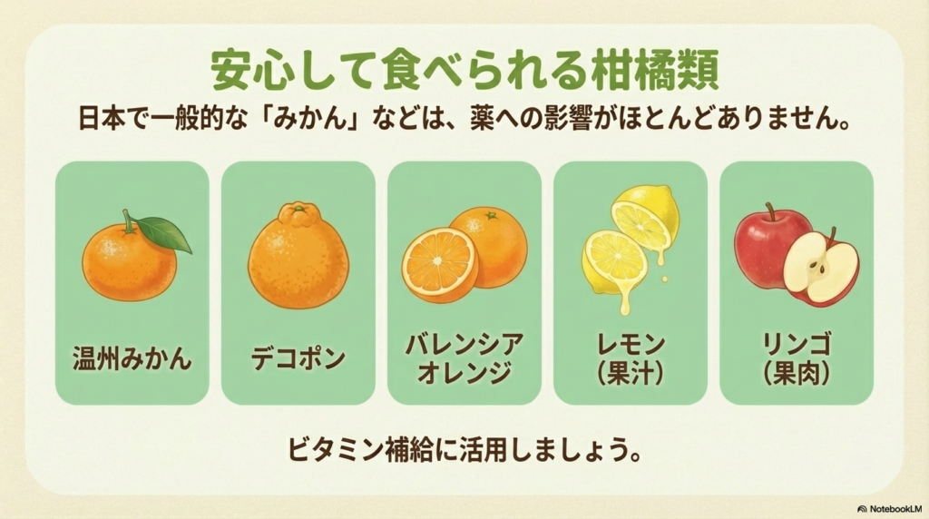 グレープフルーツや注意が必要な柑橘類は、お薬を飲んでいる期間中は食べないようにしましょう。「時間をずらせば大丈夫」ではありません。ビタミン補給には、温州みかん、リンゴ、バナナ、キウイなど、安全な果物を選びましょう。