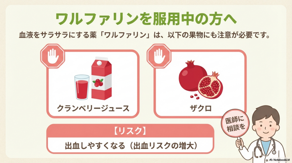 血液をサラサラにするお薬「ワルファリン」を飲んでいる方は、クランベリージュースやザクロジュースにも注意が必要です。これらの果物がワルファリンの効果を強めて、出血しやすくなる可能性があります。