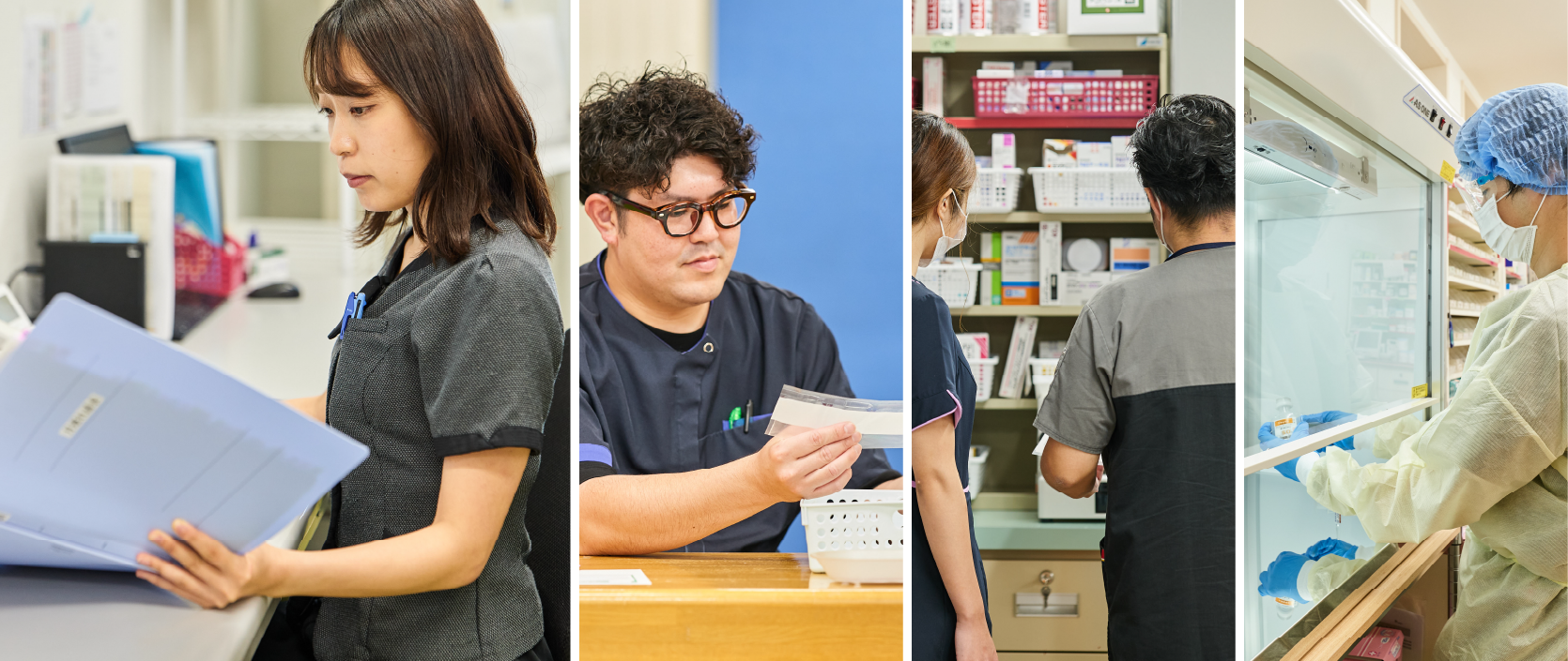 基本的な調剤業務、監査、外来投薬、施設・個人宅配達業務など。